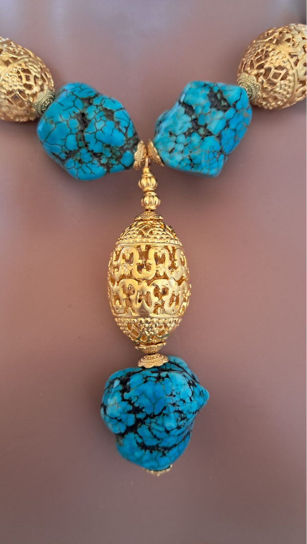 Turquoise Nugget 24K Gold Filigree Beaded Statement Necklace