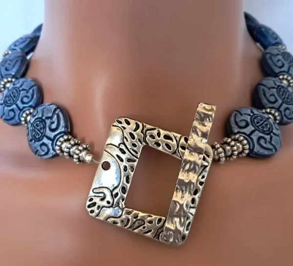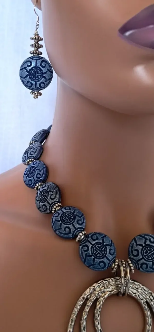 Stunning 19" long statement necklace. Designed with blue Asian round beads & silver plated rondelle beads. Large Swirl Pendant 3" x 2 3/4". Oversized ornate toggle clasp. Earrings are pierced dangle with 925 sterling silver wires, approx. 2.5" long. Each earring weighs approx. 8 grams. Set weighs approx. 126 grams