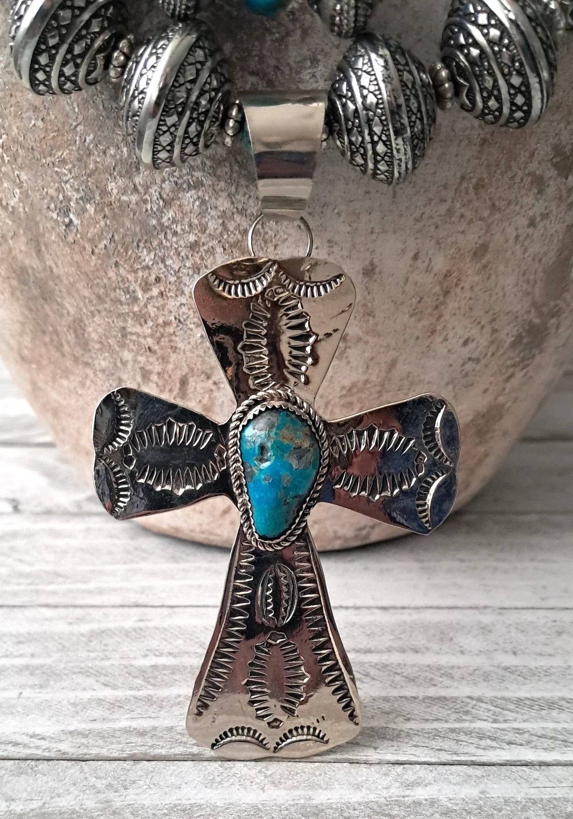 Stunning southwestern cross statement set. Necklace has large, stamped nickel silver cross pendant by Navajo Indian Jackie Cleveland, stamped JC. Accented with Imperial Jasper & silver-plated southwestern beads. Double strand with a toggle clasp. Pendant (with bail) is approx. 4 1/8" x 2 1/4". Top strand measures approx. 18 3/4". Earrings are pierced, dangle 2.5" long with 925 stamped wires. Earrings weigh 7 grams each. Set weighs 234 grams.