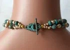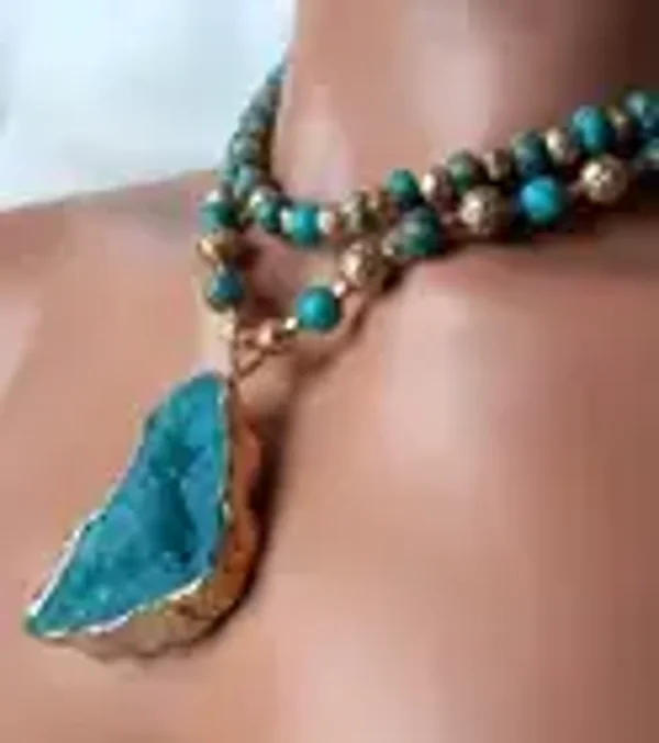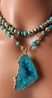 Imperial Jasper beads & lava gold beads make a striking combination. Necklace top strands is approximately 16 3/4" long. Gorgeous blue druzy pendant measures approx. 2 3/4" x 1 1/4" long. Earring are hoop, pierced, dangle - measuring approximately 2 1/2 " long. Ornate patina toggle closure. Total weight 96 grams.