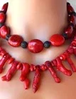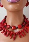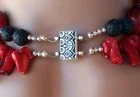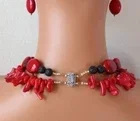 Vibrant Red Coral Branches with Black Lava Beads. Top strand is approximately 17.5" long & earrings are pierced, dangle 2 1/8" long. 206 grams total weight. Ornate silver plated magnetic clasp.