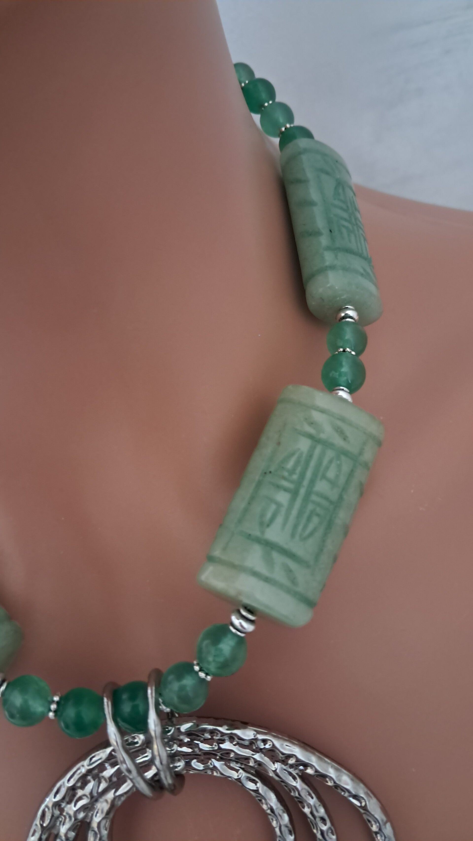 Zen Carved Aventurine Silver Circles Necklace & Earring Set