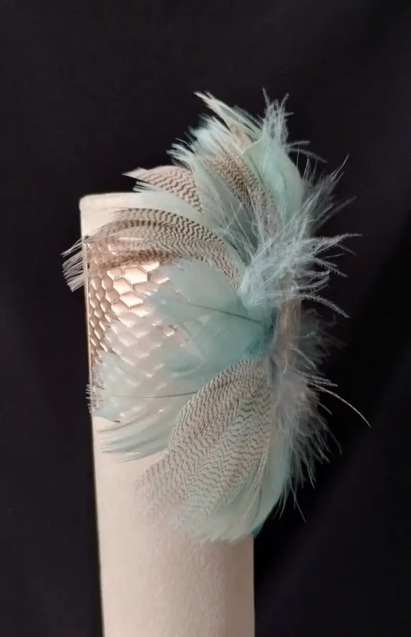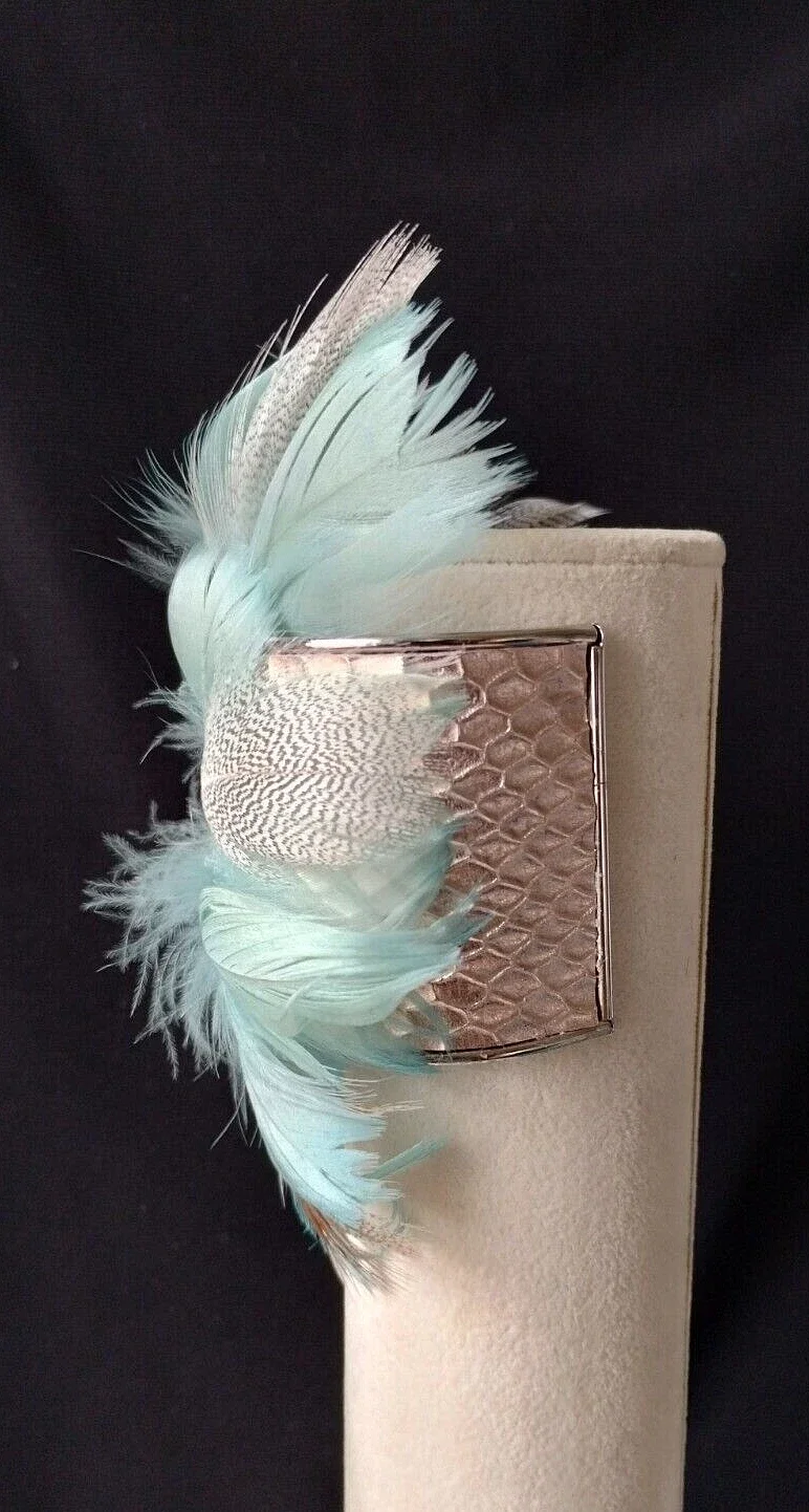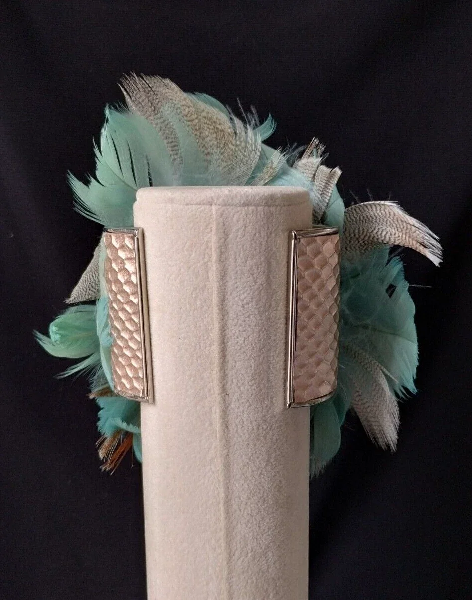 Large Imperial Jasper slab adorned with exotic feathers. Champagne genuine leather on a 2" wide metal cuff.