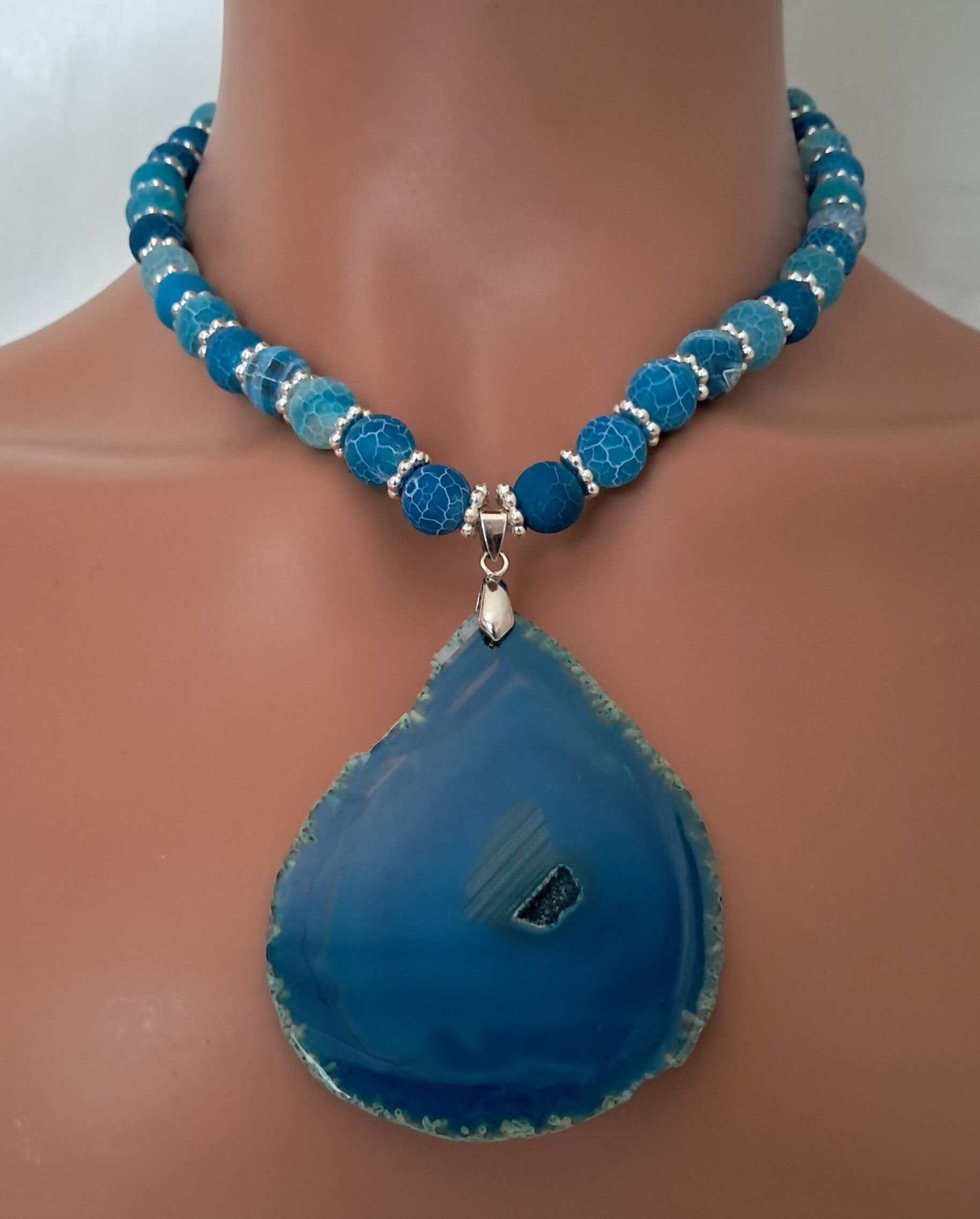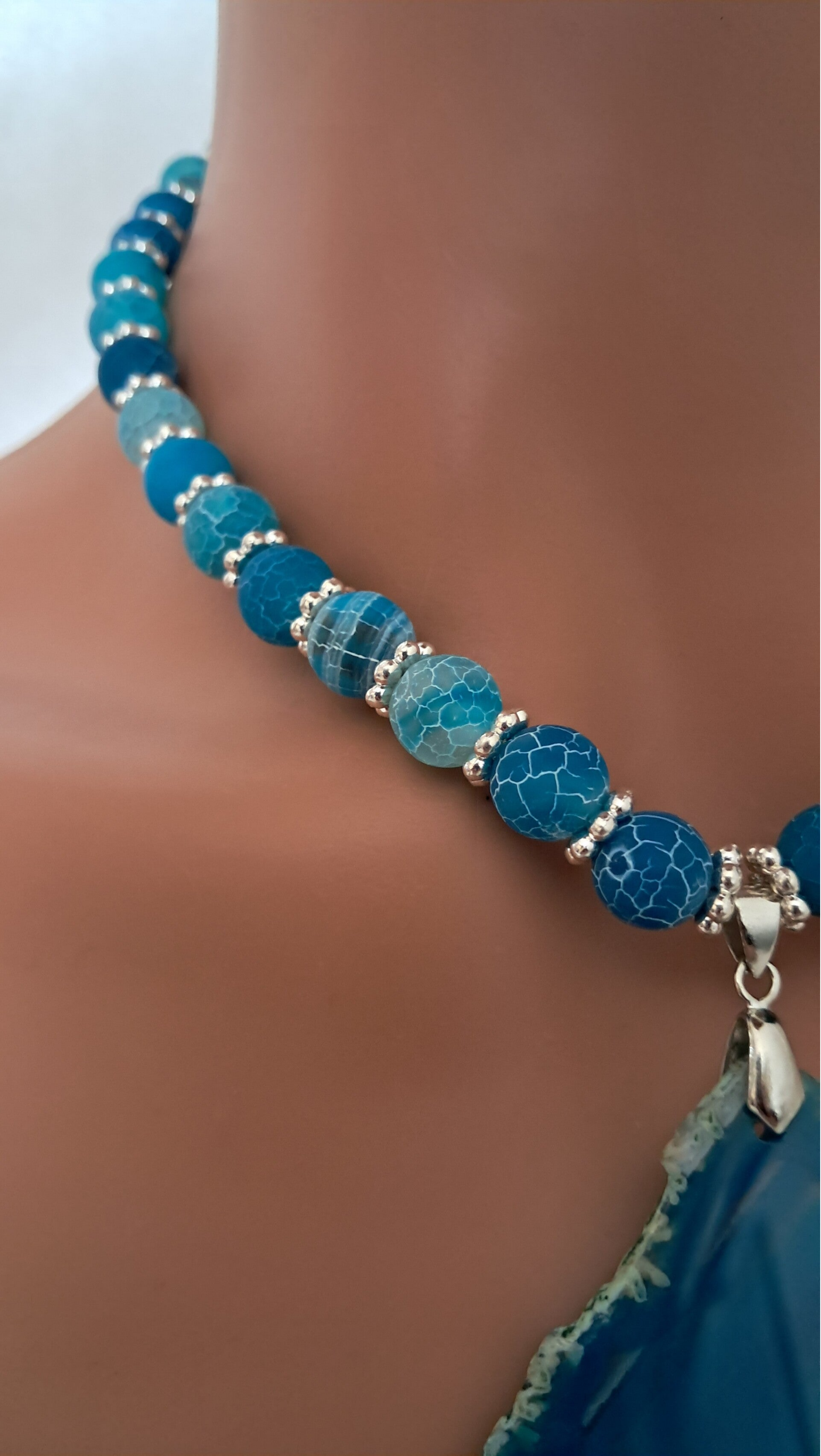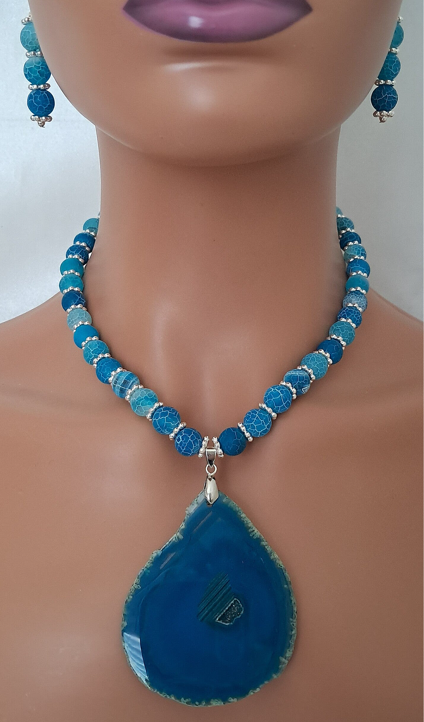 Large vibrant blue agate slice adorned with blue cracket agate and silver plated spacers. Earrings are pierced, dangle approximately 2 1/4" long, 5 grams each. With sterling 925 wires. Necklace measures 18.5" long with toggle clasp. Pendant is large 3"x 2 1/8". 100 grams total weight.