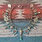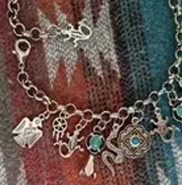 Bull skull with faux turquoise, faux coral, squash blossoms, lizards, thunderbirds, snakes & southwestern charms. Strong chain. 22 char