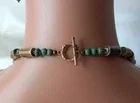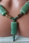 Metal patina lantern beads with brown tubular brown beads. Approximate measurements are - necklace 21.5", pendant 2 3/4" x 7/8", earrings are pierced dangle 2 1/4" long. Asian toggle clasp