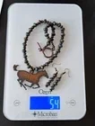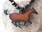 Galloping metal horse adorned with light blue impression jasper with bronze metal southwestern beads! Large hand cut iron laser galloping horse pendant. Pendant is approximately 2 7/8" x 1 1/8". Approximate measurement for necklace 16 3/4". Earrings are pierced, dangle approximately 2 1/8" long, weigh 2 grams each. Toggle clasp. Set weighs approx. 54 grams. Please view all pictures for a visual description,