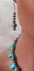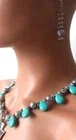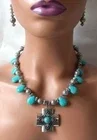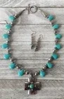 Necklace has teardrop turquoise and round silver druzy beads. Accented with silver plated southwestern beads. Toggle clasp. Pendant has faux turquoise and rhinestones. Approximate measurements - necklace 20", pendant 2" x 1.5", earring are pierced dangle 2 1/4" long.