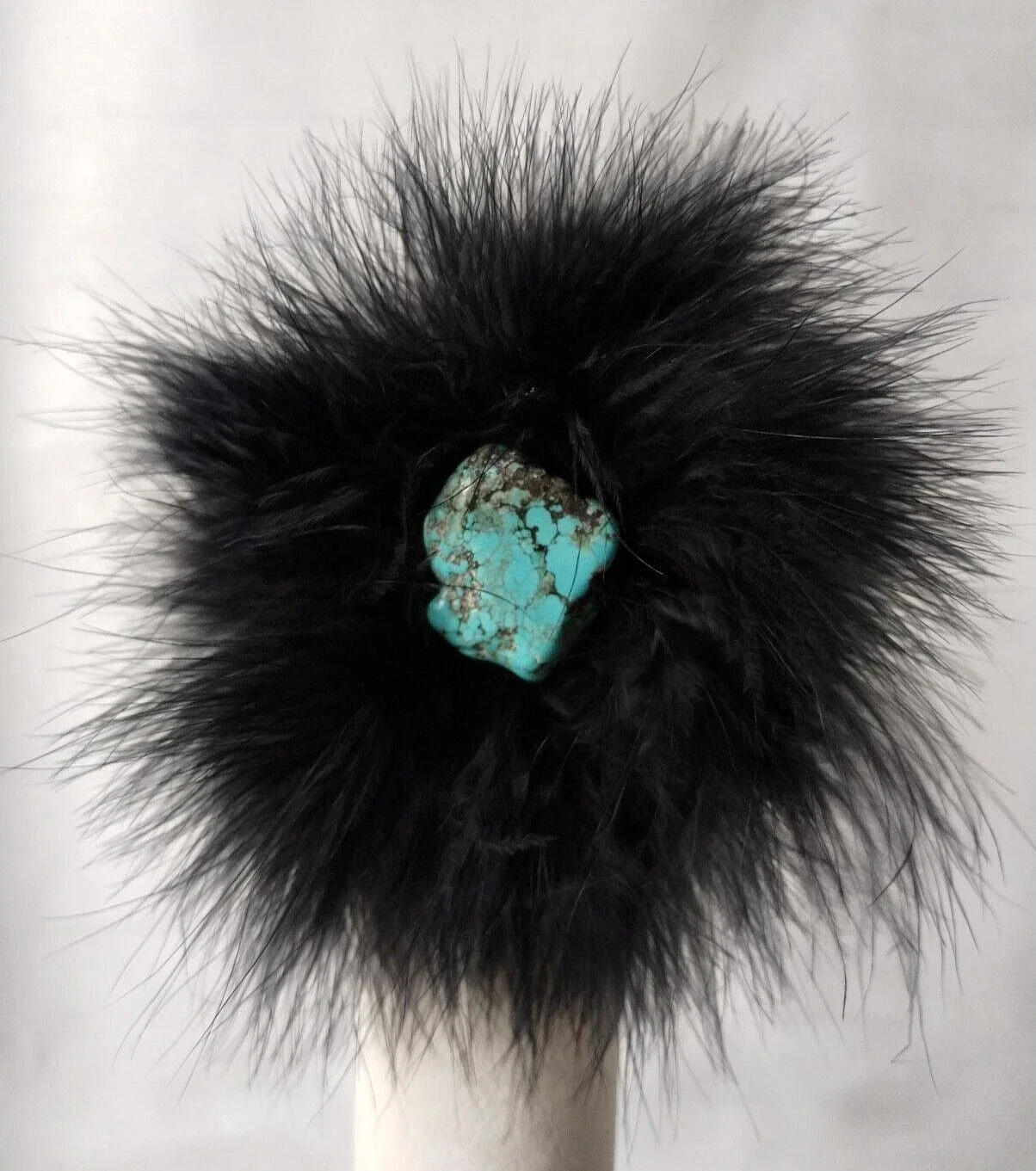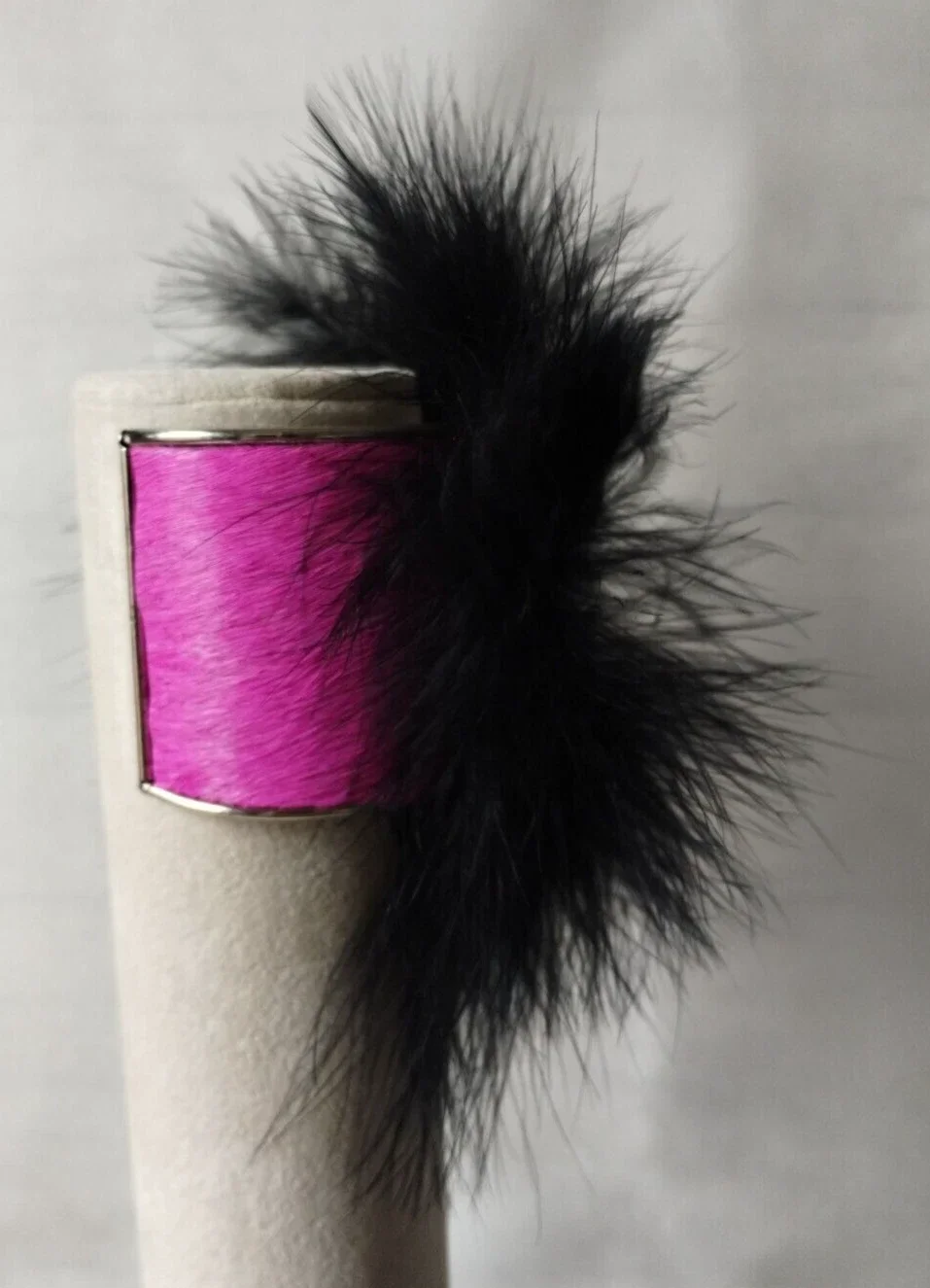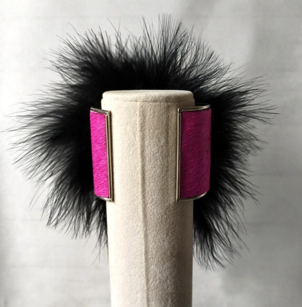 Genuine hair on hide leather on a 2" wide metal cuff. Feathers tip to tip 7". Approximate measurements: Cuff inside circumference is 6". Opening is 1 3/8". Will fit a 7 - 7 3/8" wrist. Can be "slightly" bent open to get on wrist then bent closed. Lovely gift box.
