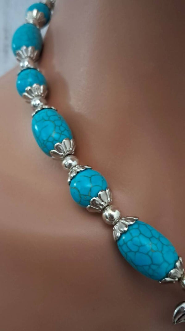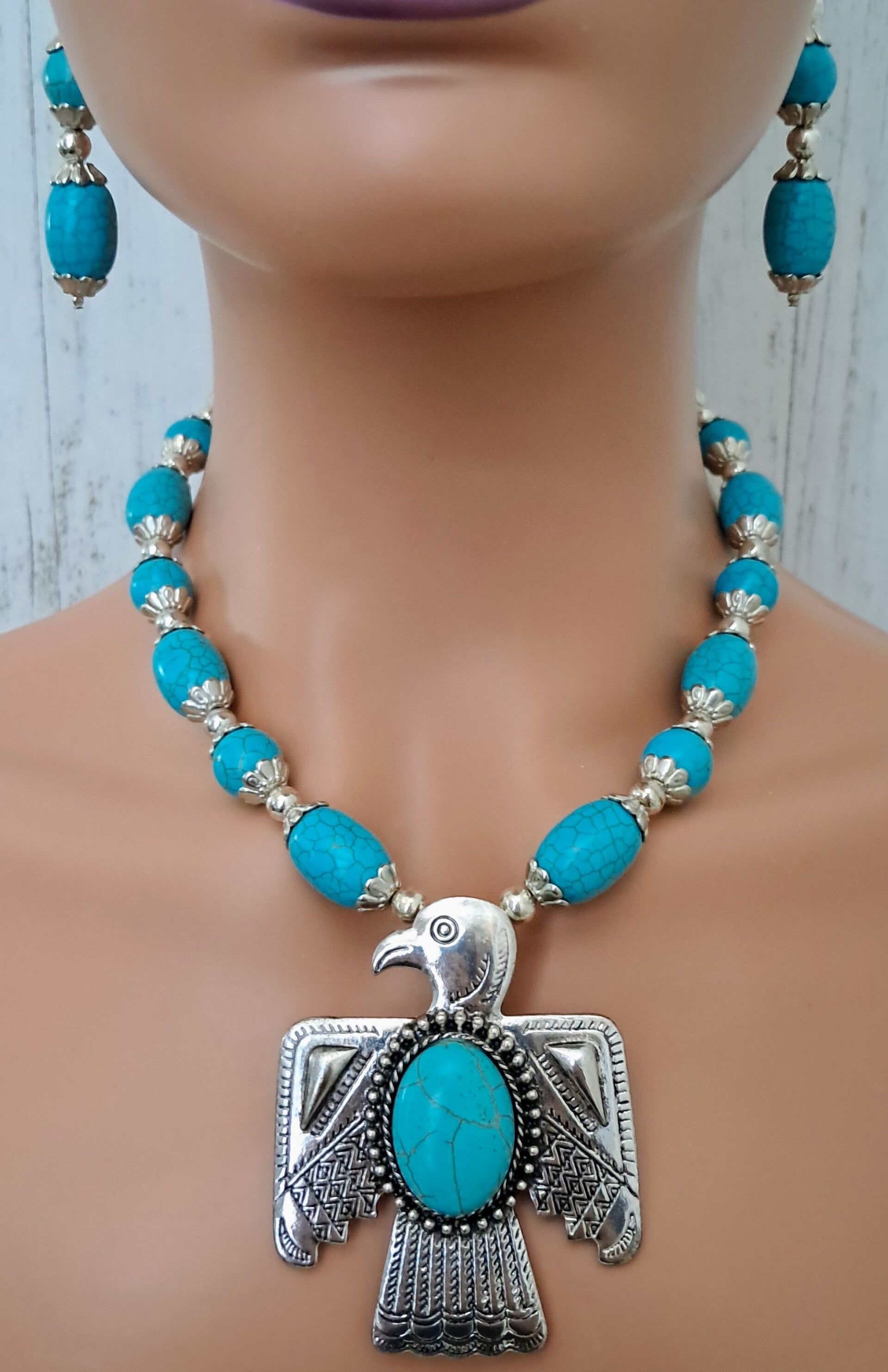 Large thunderbird with faux turquoise cabochon. Beaded with howlite turquoise & silver-plated round beads. Approximate measurements - necklace 18" long, pendant is 2 3/4" x 2 1/4". Pierced, dangle earrings 2 3/4" long with 925 wires. Wigh 8 grams each. Silver toggle clasp. Approximately 98 grams total. Lovely gift box.