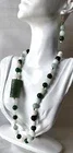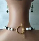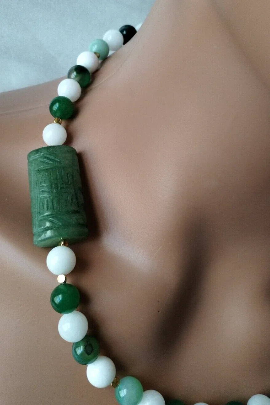Zen stunning large carved Aventurine green bead adorned with white Jade, Green Agate & Gold metal beads. Necklace is approximately 21 1/4", pierced dangle earring 2 1/4" Sterling 925 gold plated wires. Oversized gold-plated toggle clasp. Set weighs 96 grams. Gift Box.
