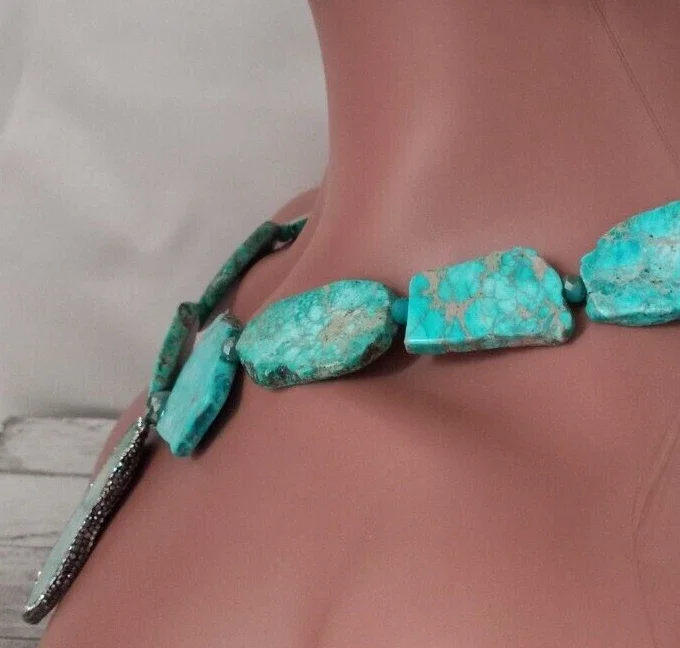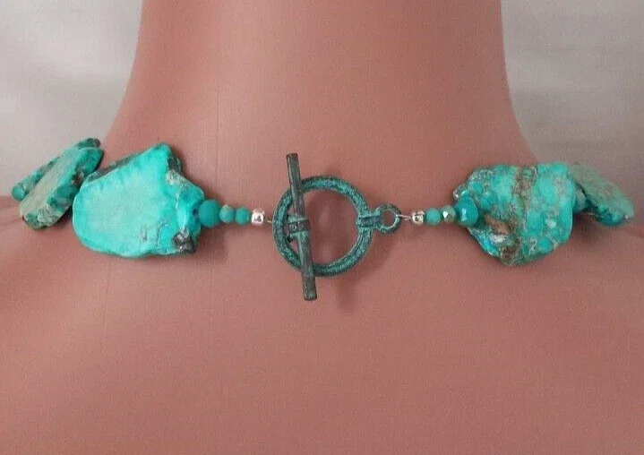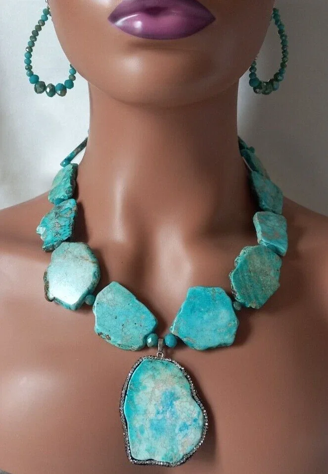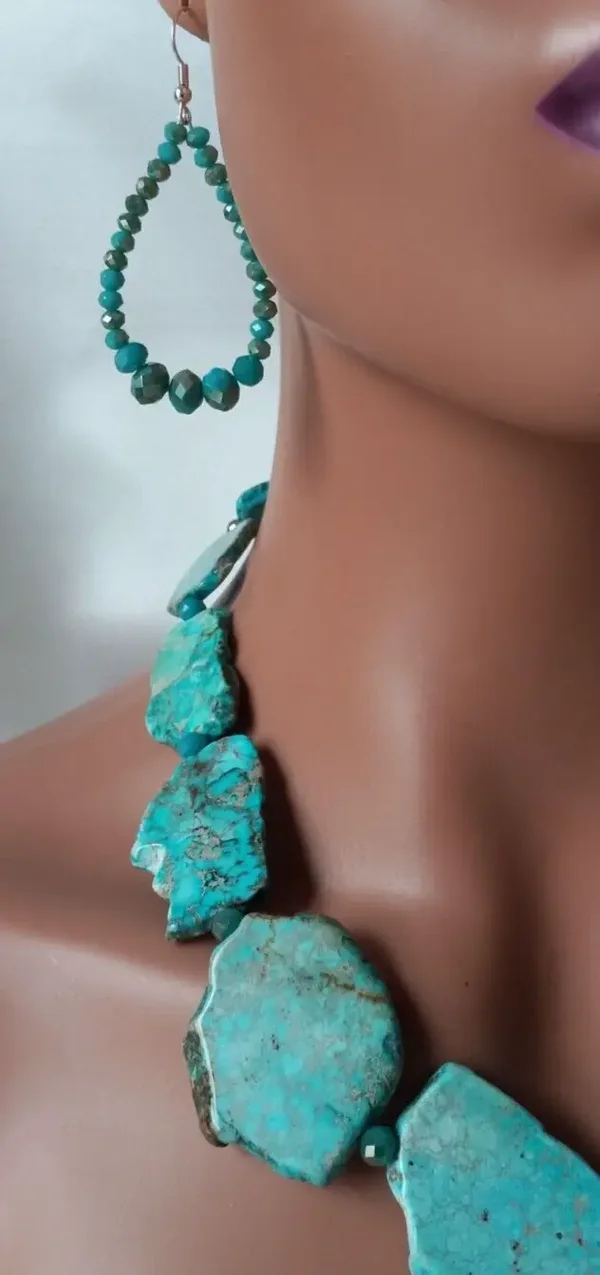 Imperial Jasper slab stones the color of the ocean, accented with faceted glass aqua beads. Necklace is approximately 21" long. Gorgeous large Imperial Jasper slab pendant with sparkly crystals measures 2 1/2" x 1 3/4." long. Earring are hoop pierced dangle measuring approximately 2.5 ". Patina toggle closure. Total weight 118 grams.