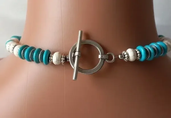 Stunning one of a kind necklace set. Large thunderbird with faux turquoise cabochon. Beaded with blue & white howlite turquoise. Southwestern silver-plated beads. Approximate measurements - necklace 17 1/4", pendant 2 3/4" x 2 1/4", pierced dangle earrings 2 1/4" long. Silver toggle clasp. Approx. 94 grams.
