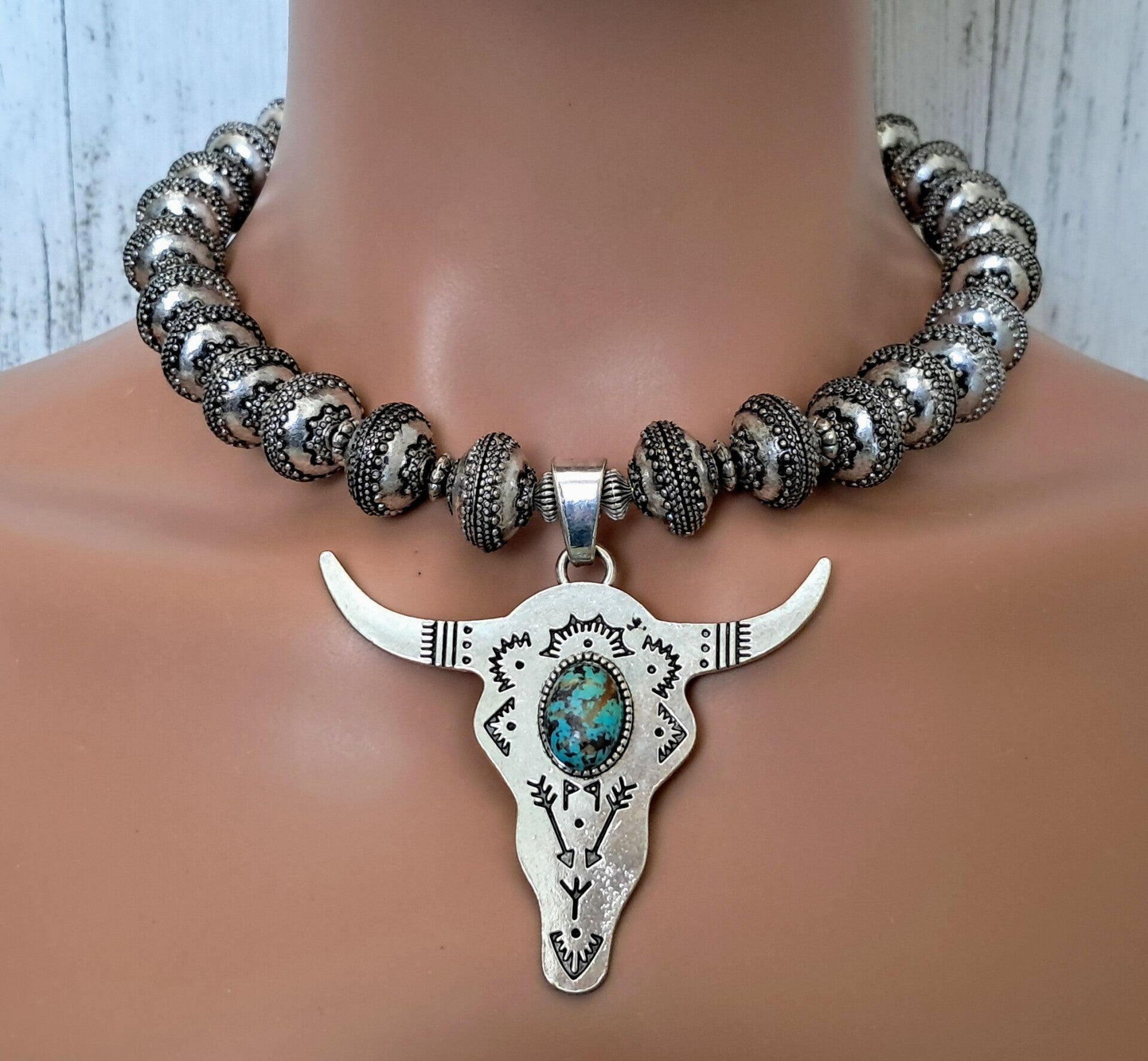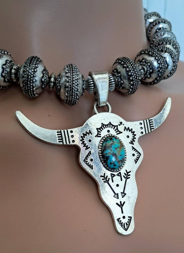 Heavy Silver antiqued rondelle metal beads with southwestern metal spacers to add western flair! Large silver Longhorn Bull Head Pendant with genuine turquoise cabochon. Pendant is approximately 2 3/4" x 2 7/8". Approximate measurement for necklace 17 3/4". Toggle clasp. Earrings are pierced, dangle with concho post. Approximately 2 1/4" long, weigh 10 grams each. Set weighs approximately 167 grams. Lovely gift box.