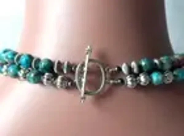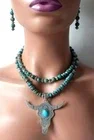 Southwestern double strand Imperial Jasper beads & silver-plated western metal beads. Large silver Longhorn Bull Head Pendant with genuine turquoise cabochon stone. Pendant is approximately 3" x 2 3/4". Top strand is approximately 17 1/8". Earrings are pierced dangle approximately 2.5" long. Set weighs 116 grams.