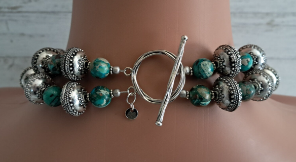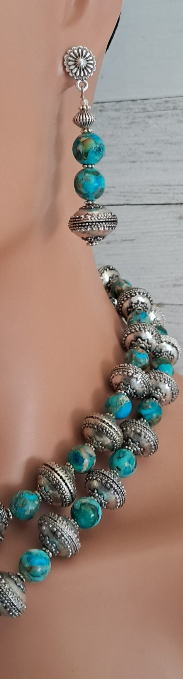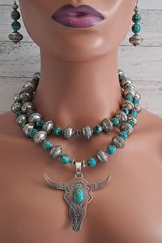 Southwestern double strand Imperial Jasper beads & silver-plated heavy metal beads. Large silver Longhorn Bull Head Pendant with genuine turquoise cabochon stone. Pendant is approximately 3" x 2 3/4". Top strand is approximately 17 1/4". Toggle clasp. Earrings are pierced, dangle with silver plated concho posts. Approximately 2 1/2" long. Earrings weigh approximately 8 grams each. Set weighs 228 grams total. Lovely gift box.