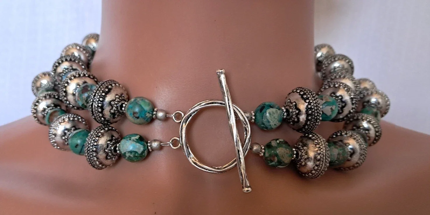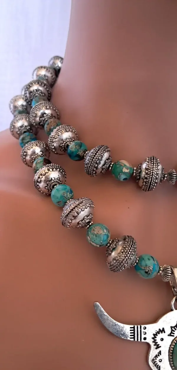 Southwestern double strand Imperial Jasper beads & silver-plated heavy metal beads. Large silver Longhorn Bull Head Pendant with genuine turquoise cabochon stone. Pendant is approximately 3" x 2 3/4". Top strand is approximately 17 1/4". Toggle clasp. Earrings are pierced dangle with 925 wires. Approximately 2 1/4" long. Earrings weigh approximately 6 grams each. Set weighs 226 grams total. Lovely gift box