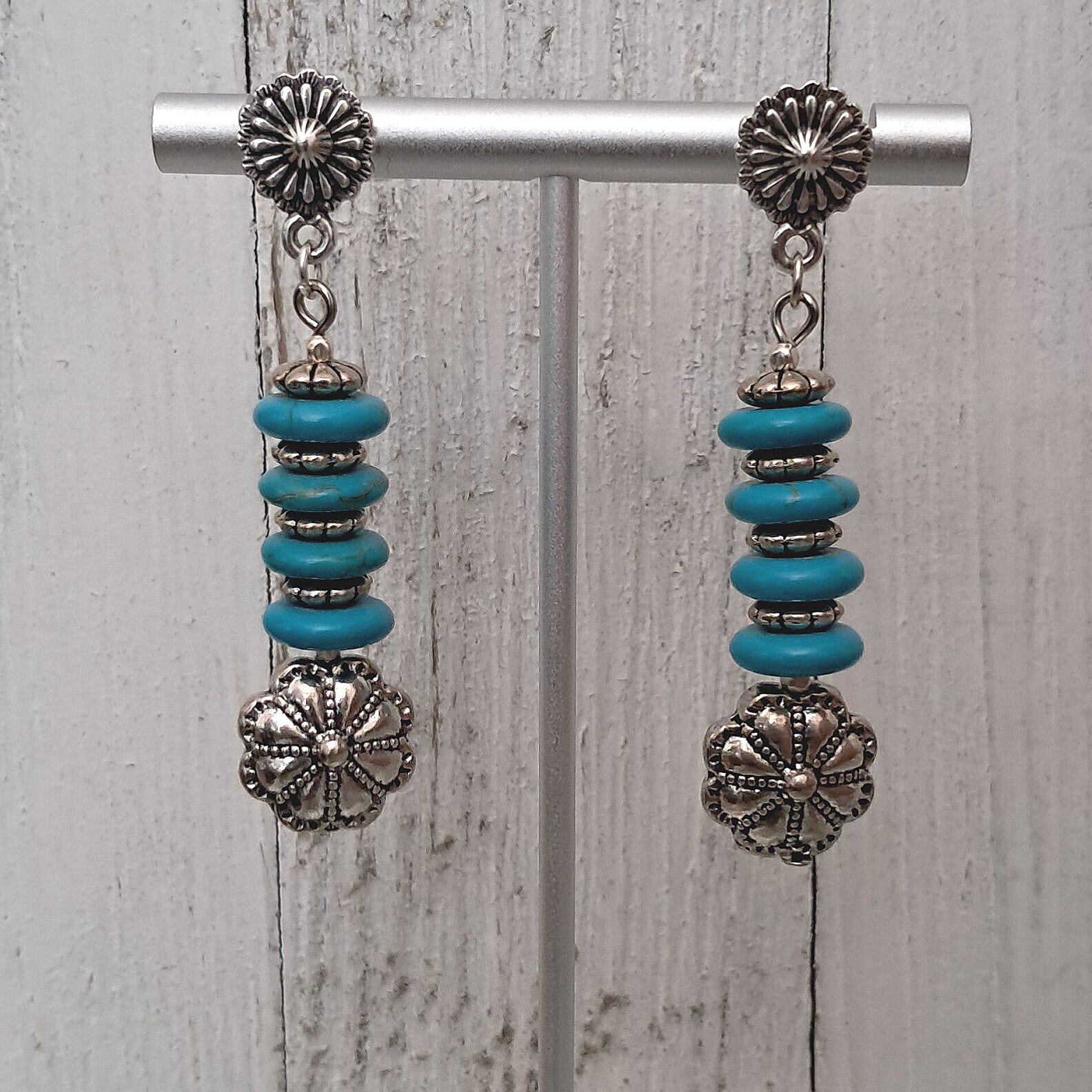 Large Longhorn Bull Head Pendant with genuine Kingman turquoise cabochon. Pendant is approximately 2 3/4" x 2 3/4". Approximate measurement for necklace 16.5". Howlite turquoise stone discs, silver plated western lentil beads & southwestern metal spacers. Earrings are pierced, dangle with southwestern concho post. Approximately 2 1/4" long, weigh approximately 8 grams each. Toggle clasp. Set weighs approx. 115 grams.
