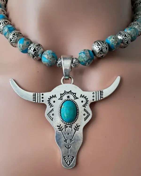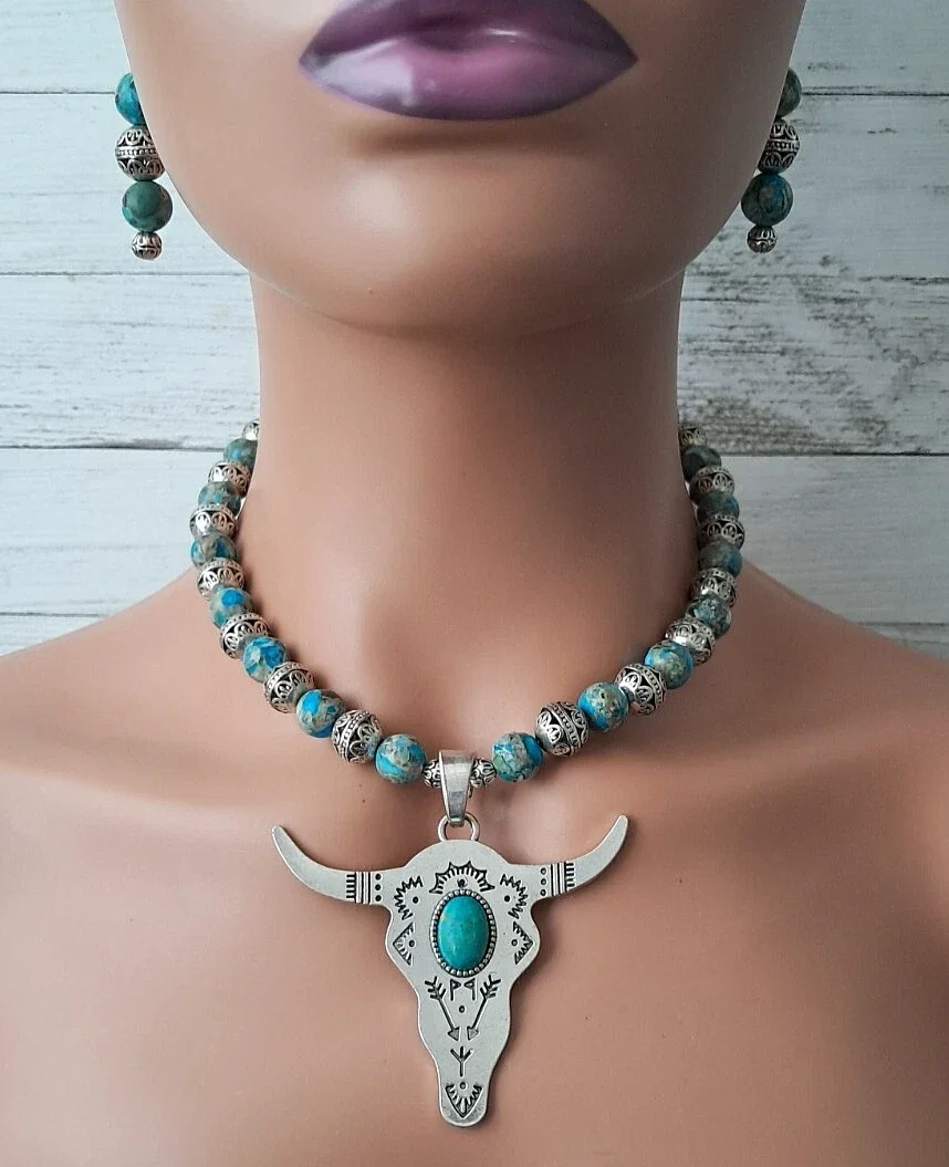 Welcome to the wild west! Stunning - One of a kind, 10mm Imperial Jasper round beads adorned with silver-plated filigree round beads. Large silver Longhorn Bull Head Pendant with genuine turquoise cabochon. Pendant is approximately 2 3/4" x 2 3/4". Approximate measurement for necklace 16.5". Earrings are pierced, dangle approximately 2 1/8" long with 925 sterling wires. Toggle clasp. Set weighs approx. 82 grams.