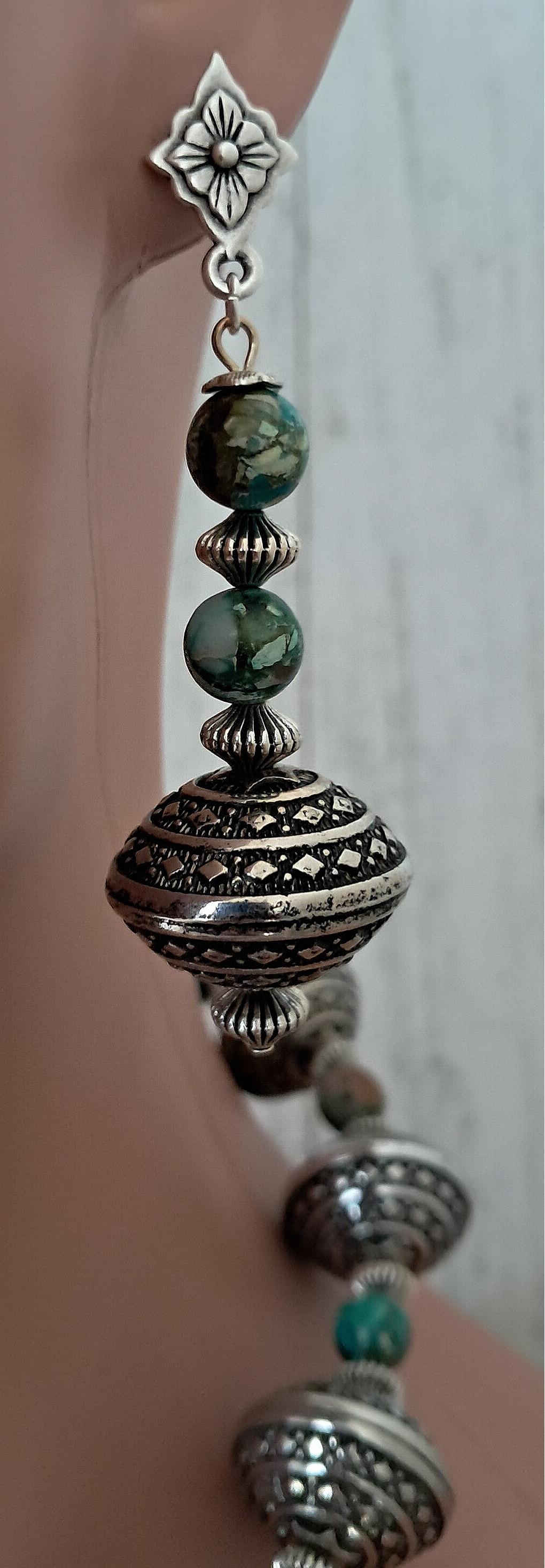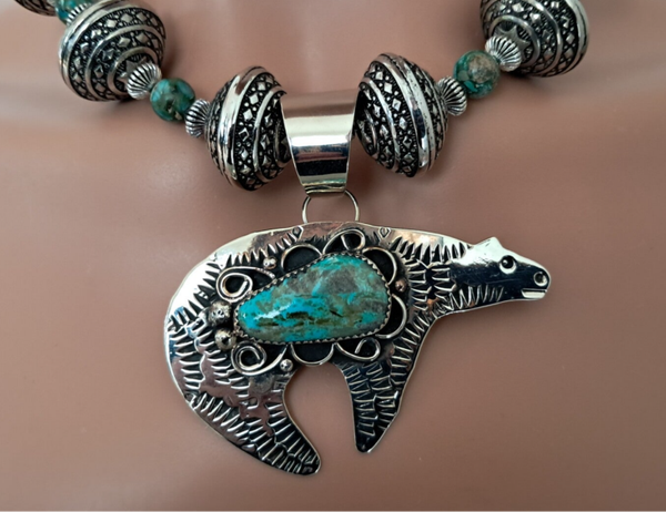 Stamped Nickle Silver bear pendant by Native American artist Jackie Cleveland. Large turquoise cabochon. Pendant is signed & approximately 2 3/4" x 2 3/4". Necklace is made of large ornate silver-plated bicone beads with Imperial Jasper round beads. Necklace is approximately 18 1/4". Earrings are pierced dangle with southwestern post - approximately 2 3/4" long, weighing 8 grams each. Set weighs 109 grams. Lovely gift box.