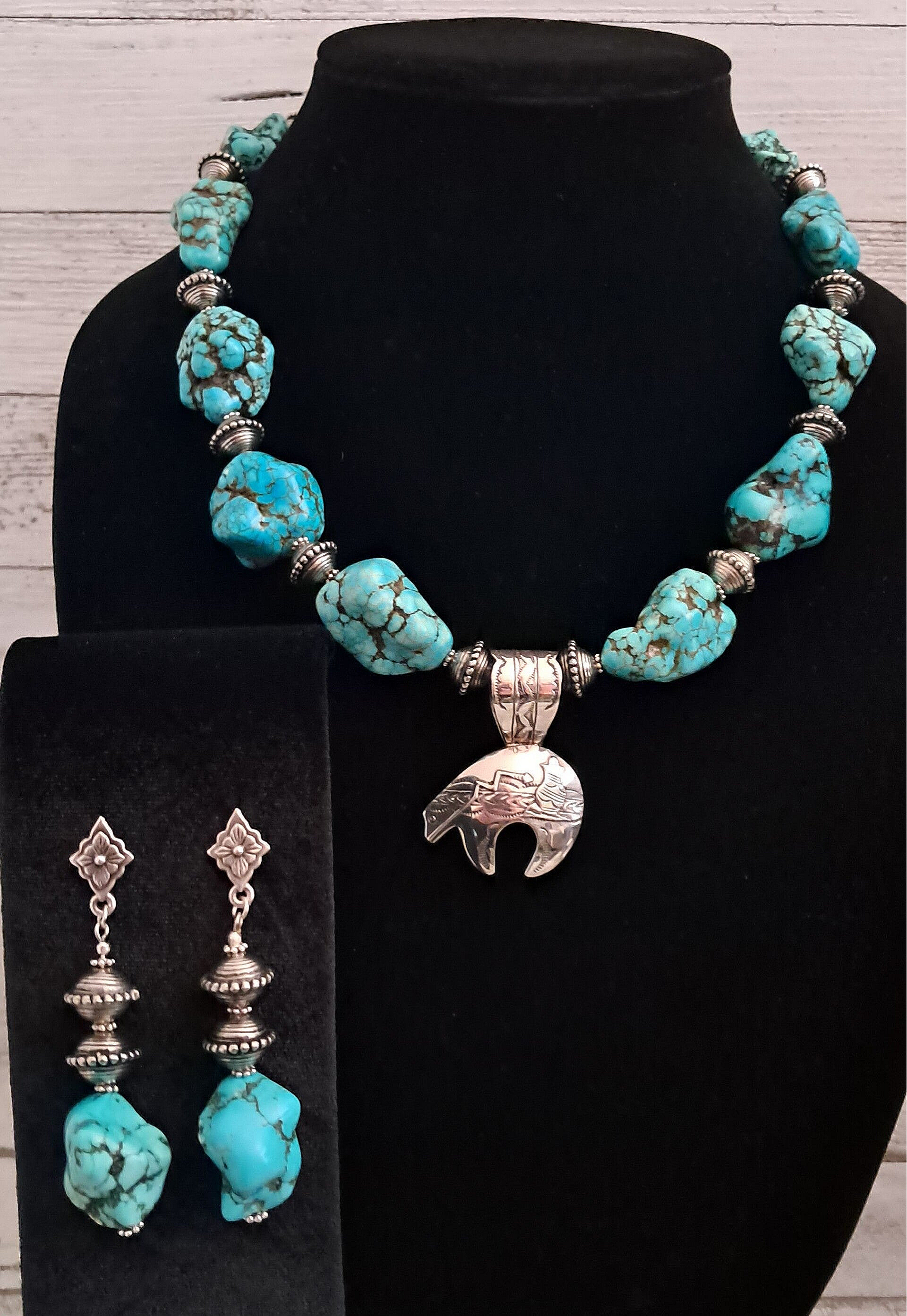 Vintage J Delgarito hollow southwestern bear pendant signed and stamped sterling. Pendant is approximately 1 5/8" x 2", weighs 9 grams. Adorned with large howlite turquoise nuggets. Silver plated metal beads. Toggle clasp. Necklace is approximately 20" long. Weighd 136 grams.