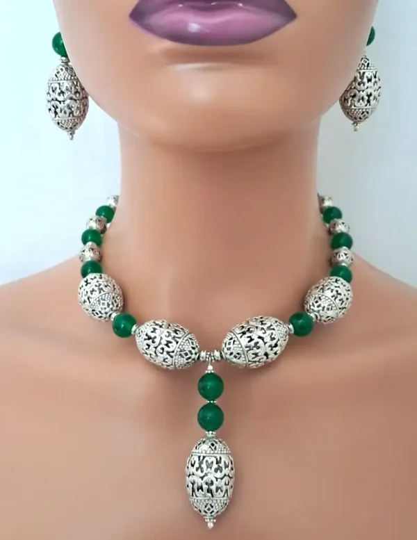 Stunning Huge Antique Silver-plated filigree beads (30mm-19mm) adorned with dark green Quartzite 10mm stone beads.
