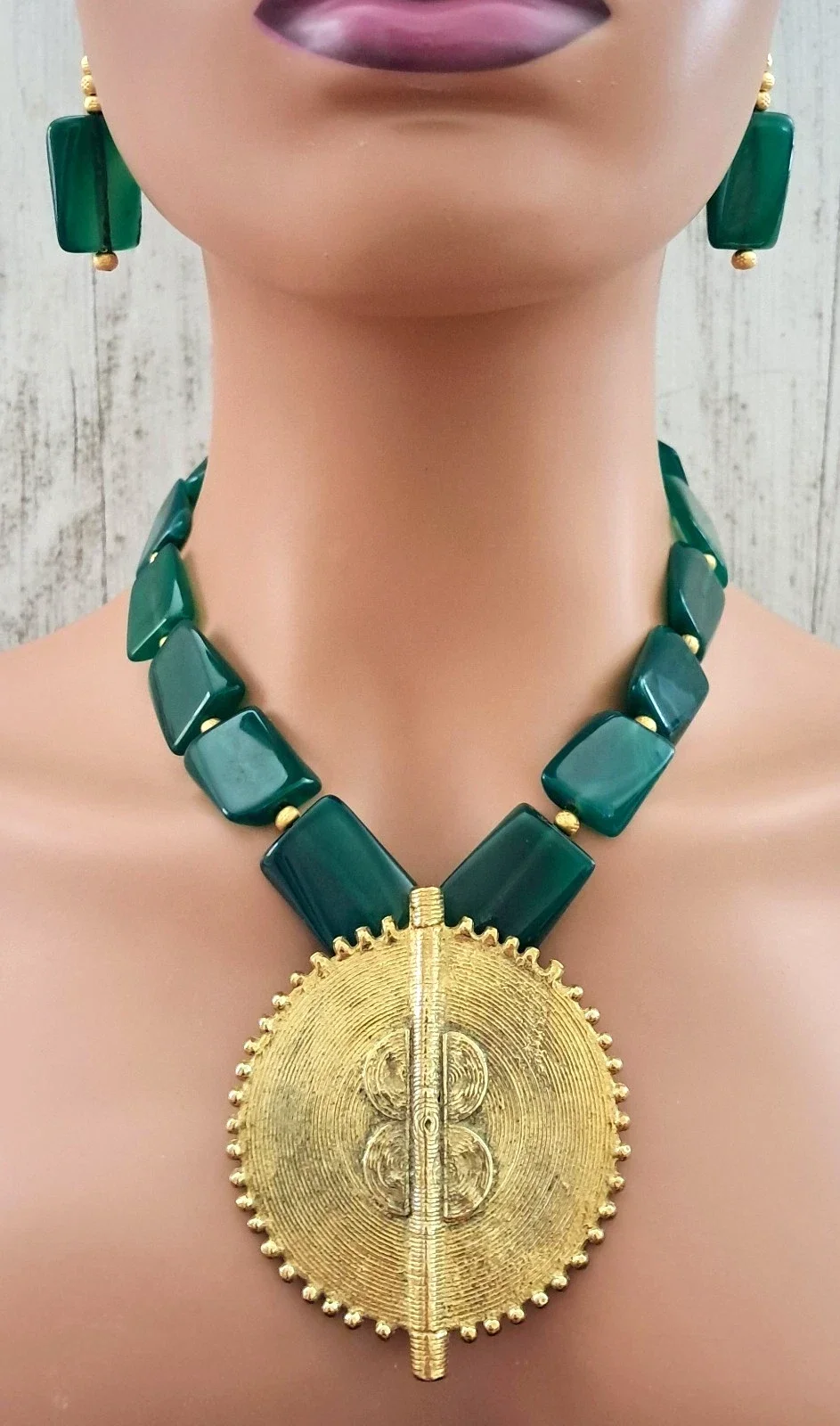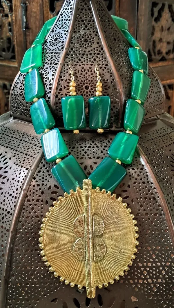 Green Agate African Brass Coil Sun Pendant Beaded Statement Necklace Earring Set