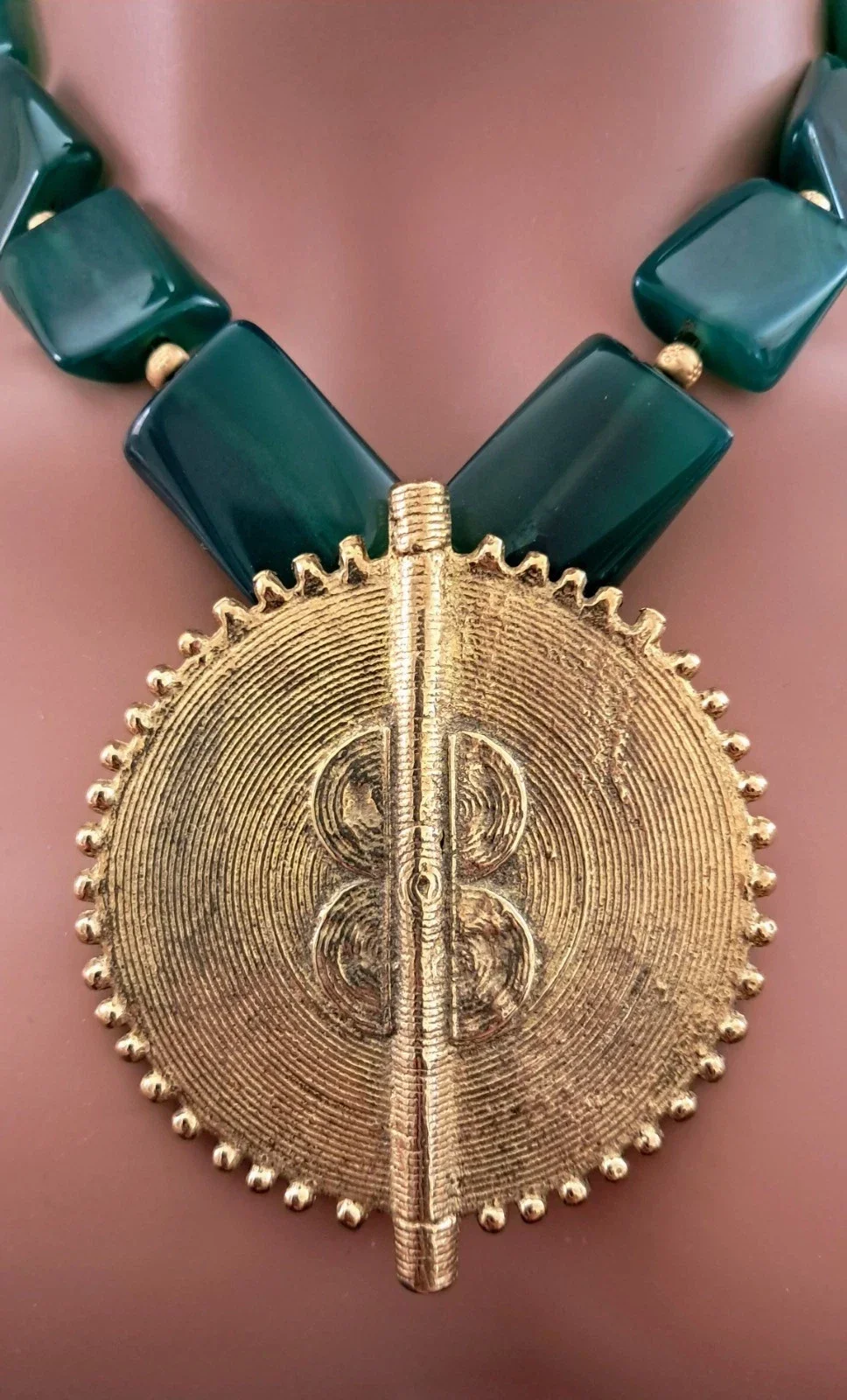 Stunning huge Brass African Coil Sun Pendant 2 7/8" x 2.5" adorned with green agate 1" rectangle beads. Accented with small 5 mm gold-plated metal beads.