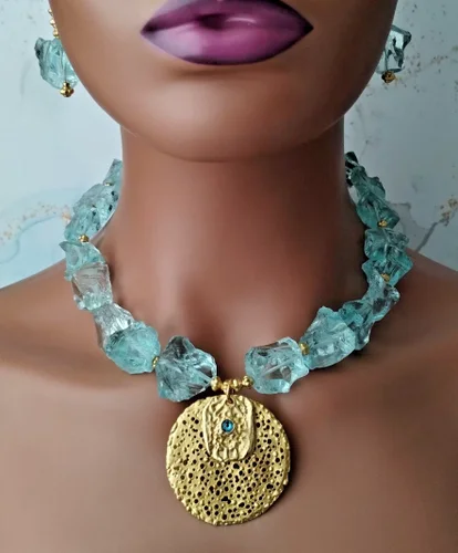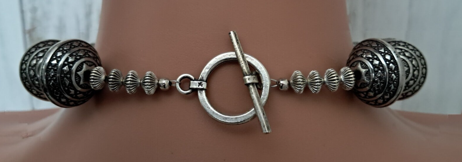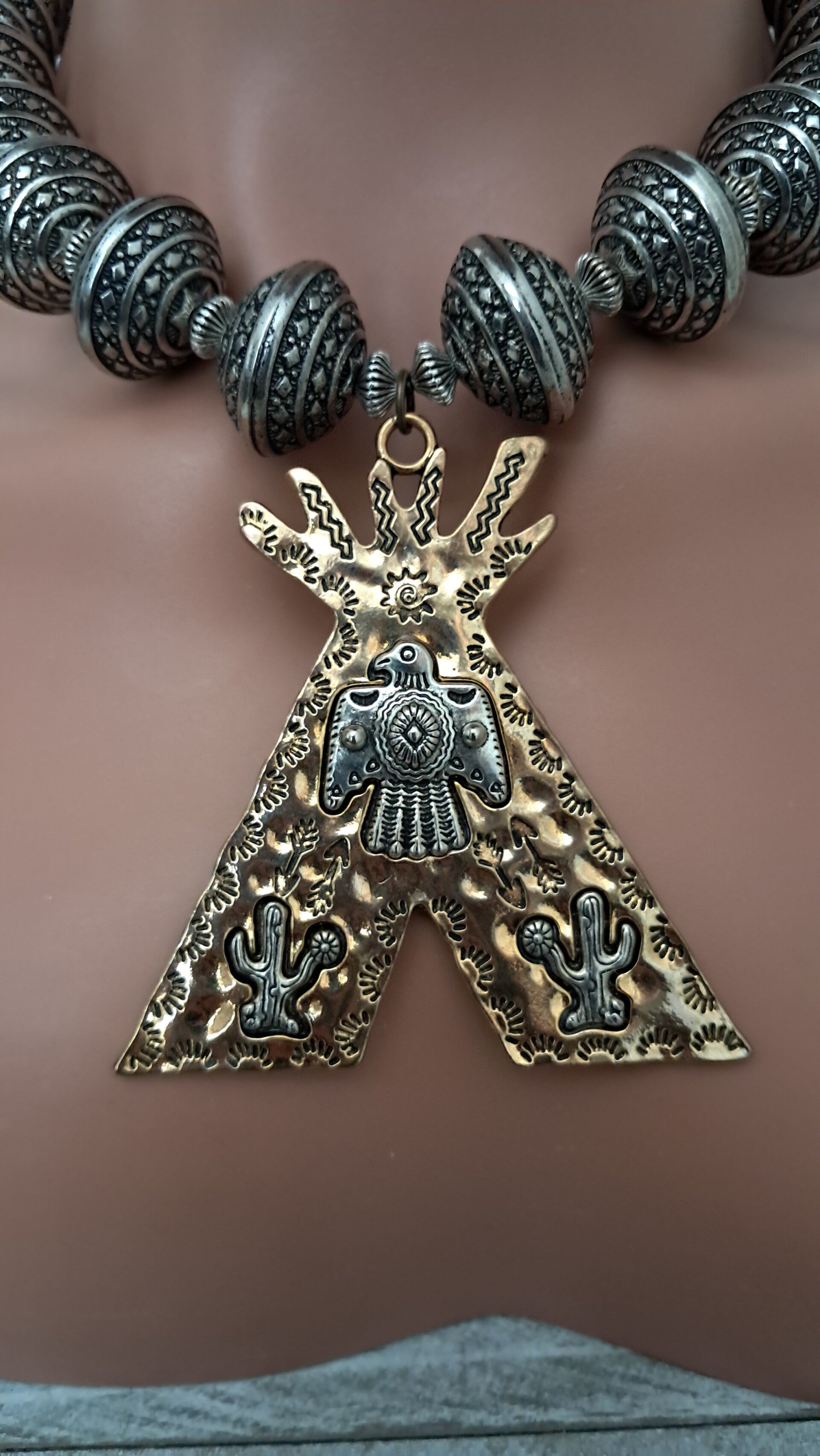 Southwestern large Teepee pendant necklace earring set. Adorned with large silver plated bicone metal beads. Approximate measurements: necklace 18" pendant 3" x 2 3/4". Toggle clasp. Pierced dangle earring 2.5", with southwestern post. Weigh 7 grams each. Set weighs approximately 121 grams. Lovely gift box.