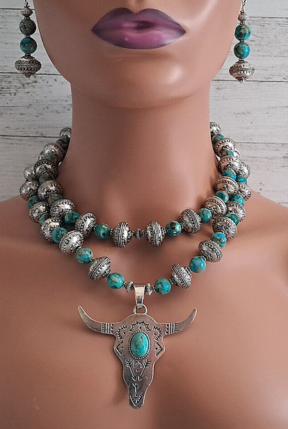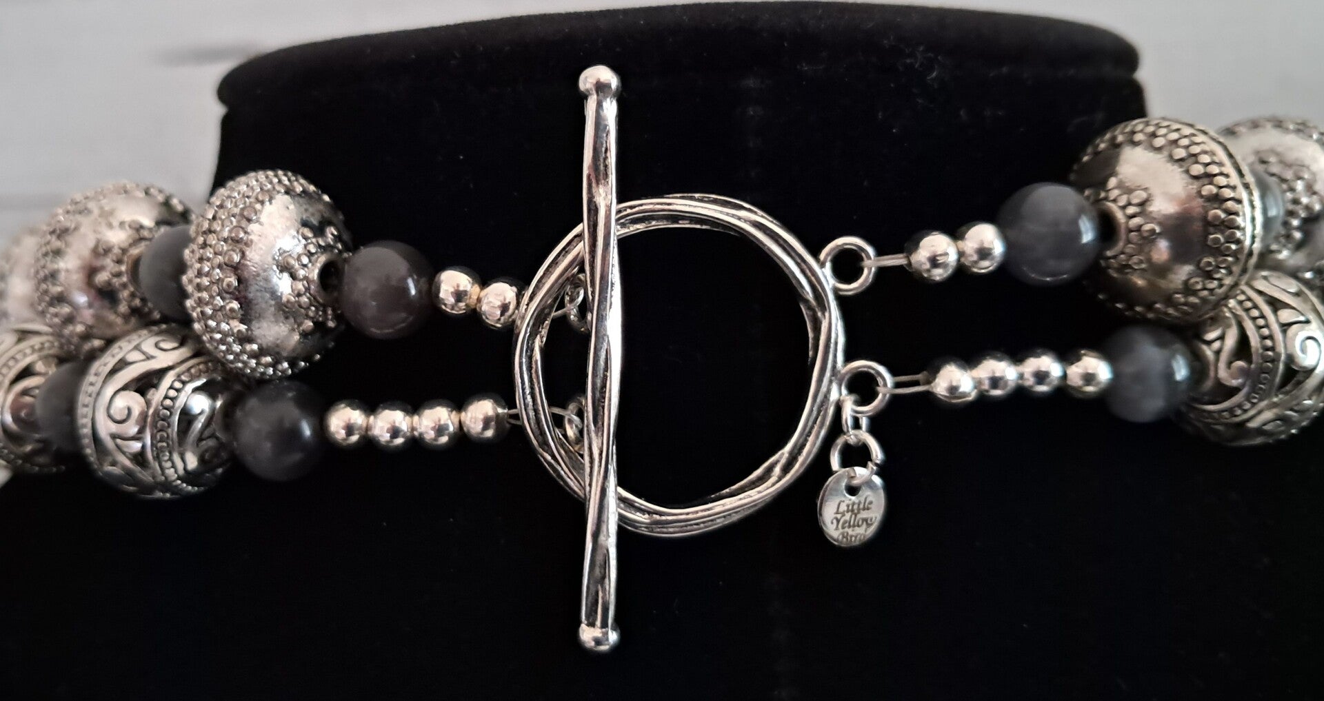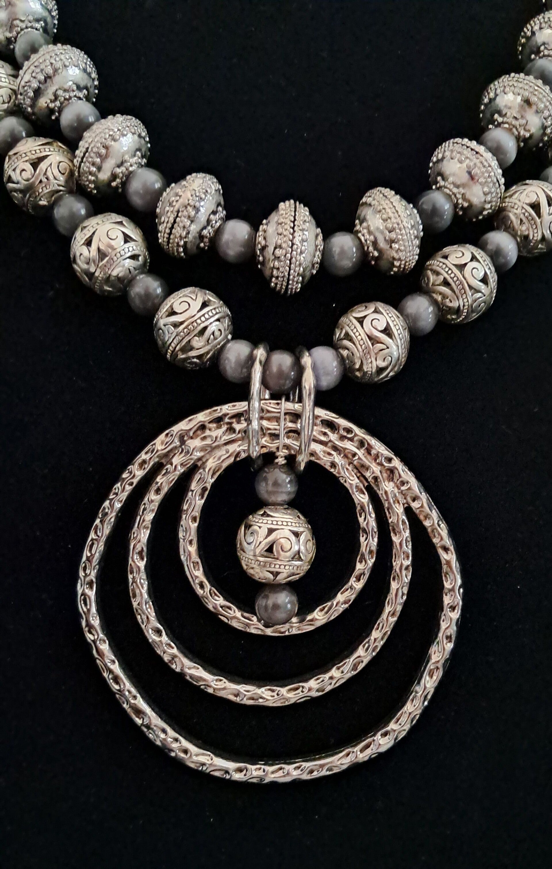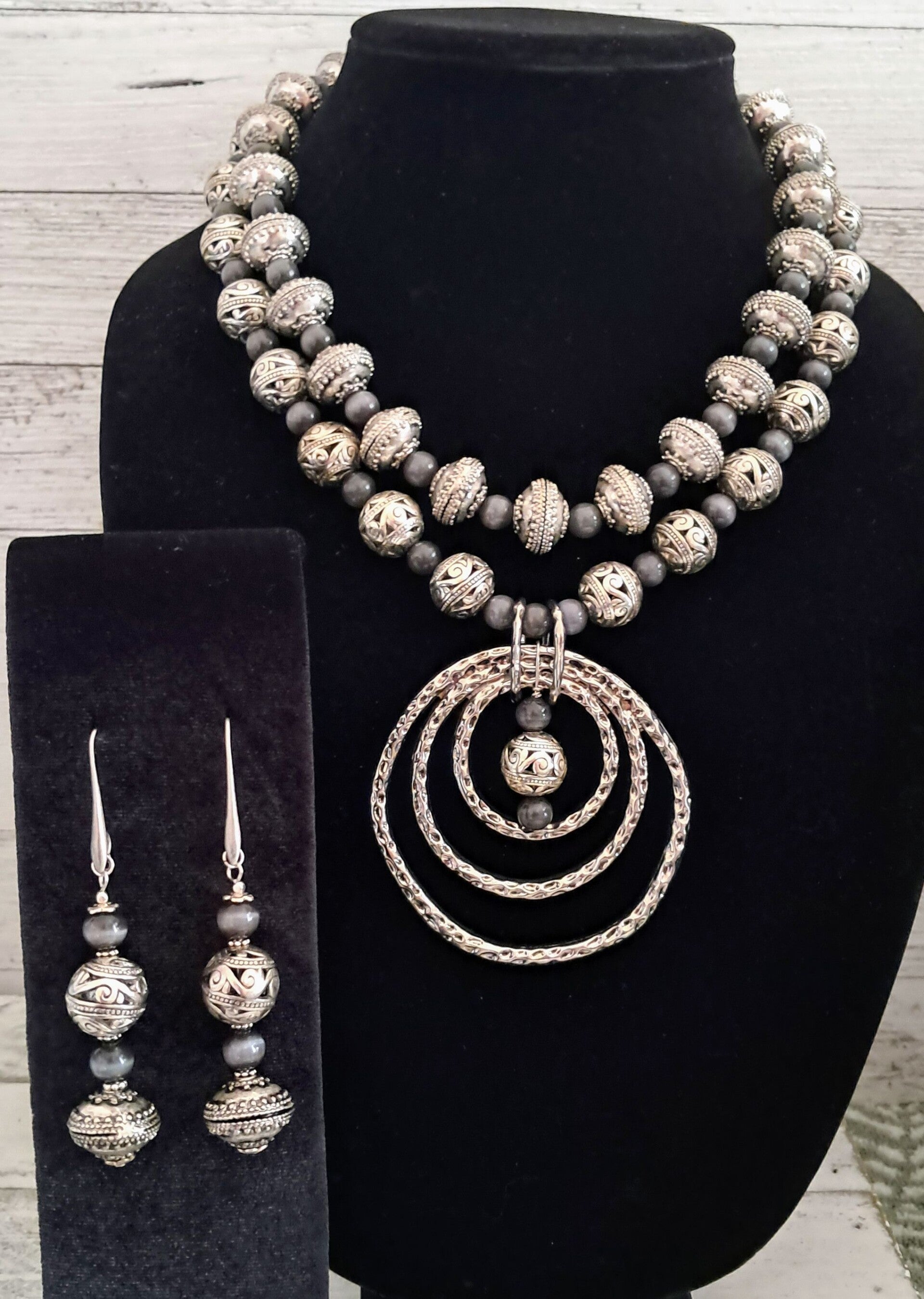 Bold statement set, Necklace is double strand with vintage grey cat eye beads (7mm), adorned with 10mm round filigree & bicone heavy silver metal beads. Toggle clasp. Top strand 18.5", large circle pendant 3 1/4" x 2 3/4". Necklace weighs 216 grams.